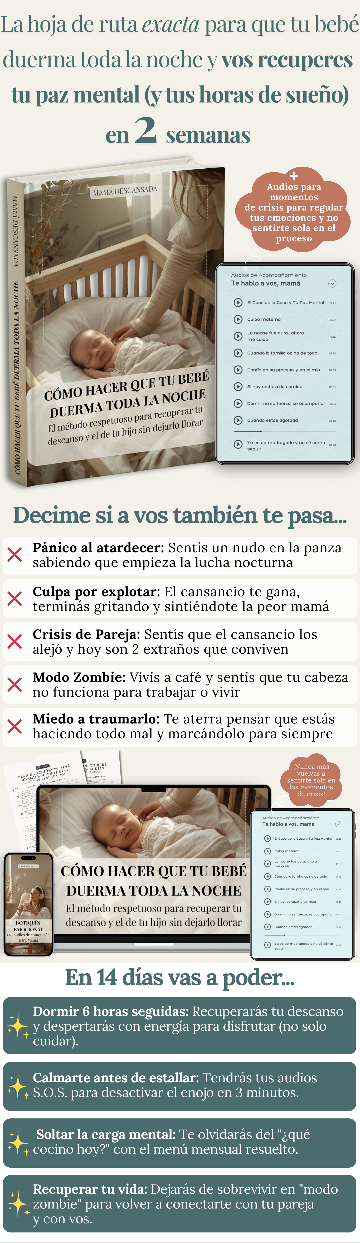 La Guía de Sueño es directa al grano, con pasos claros tipo "Hacé esto, luego esto". Y los Audios son cortos (de 3 a 10 minutos) para que los escuches mientras lavás los platos, das la teta o vas en el auto.